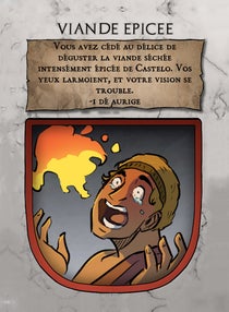 - Vous n'avez pas pu résister a la tentation de la viande épicée de castelo malgré son gout exquis elle est tellement épicée qu'elle cause des larmoiements incessants pendant plusieurs heures embrouillant votre vue.