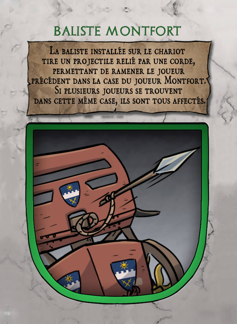 - Cette réplique de la baliste légendaire, nommée Tina sur le champ de bataille a été adaptée au char de course Montfort. Sa précision maniée par un aurige compétent devient un élément décisif sur la piste.