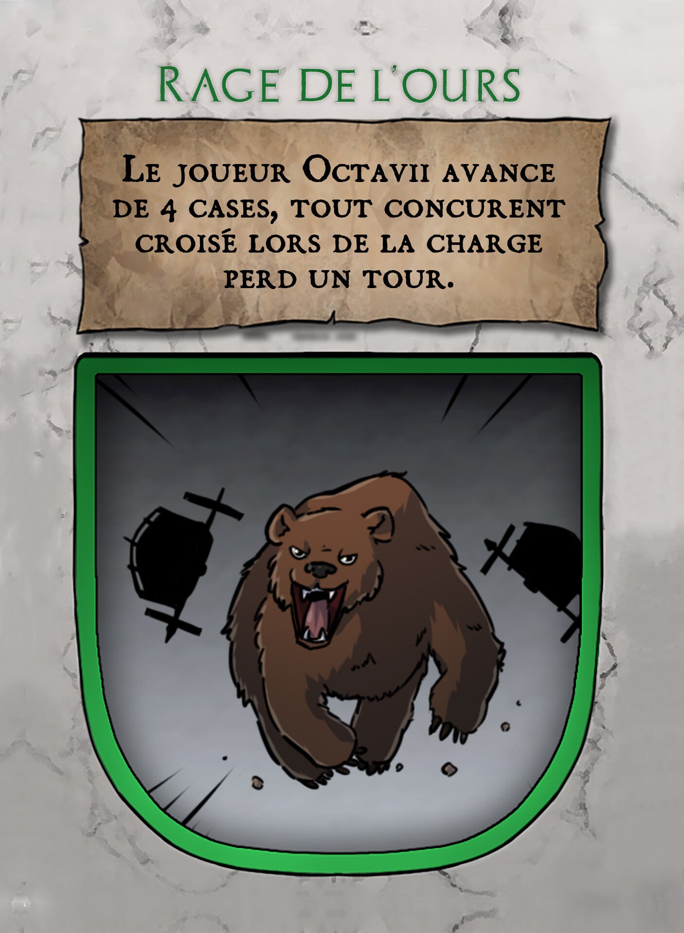 - L'aurige Vigneron verse le contenu de son amphore sur la case, créant un trou de vase qui s'étend progressivement jusqu'à l'évaporation complète de l'alcool.