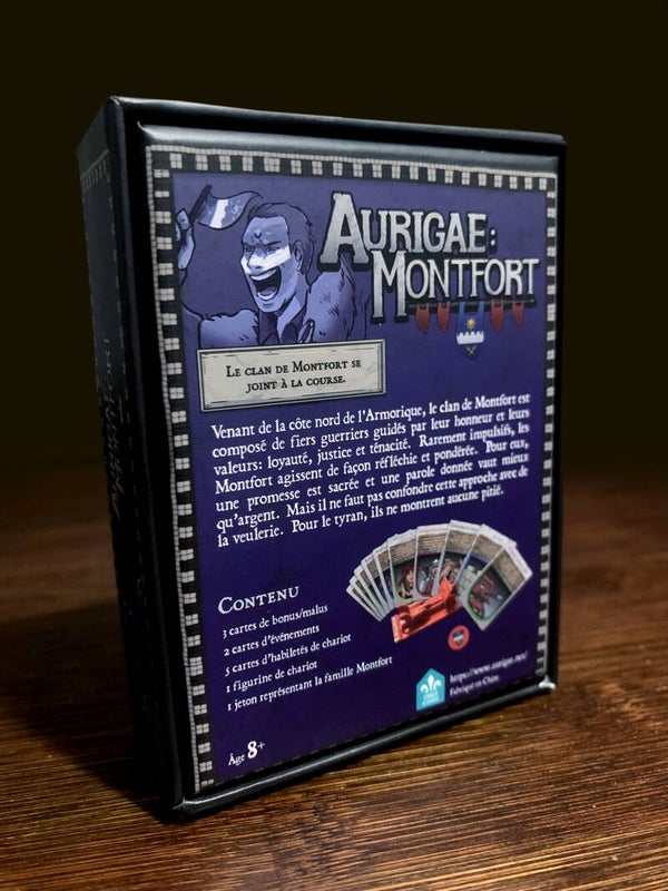 La premìere expansion officielle. Venant du fin fond du nord de l'armorique, le clan Montfort se joint à la course. 3 nouvelles cartes de bonus/malus 2 nouvelles cartes d'évènements, 5 cartes d'habiletés de chariot, une figurine représentant l'écurie Montfort ainsi qu'un jeton pour suivre les tours parcourus. Le tout inclus dans une boite personalisée à l'écurie Montfort. Jeu de base nécéssaire pour utiliser cette expansion.